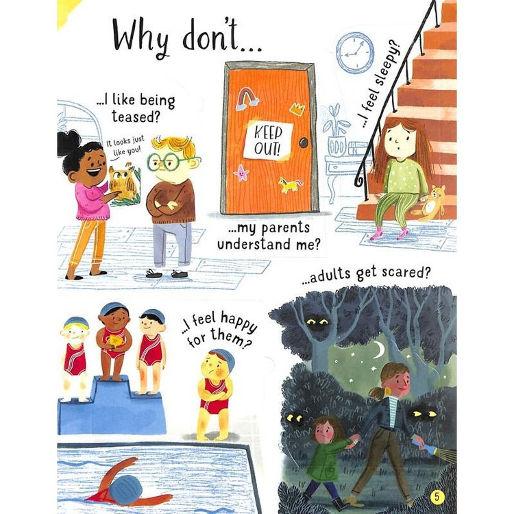 این کتاب درباره ی احساسات کودکان پرسشهای جالبی مطرح می کند که کودک پس از حدس پاسخ می تواند بازشو کوچک را بلند کند و پاسخ را ببیند.