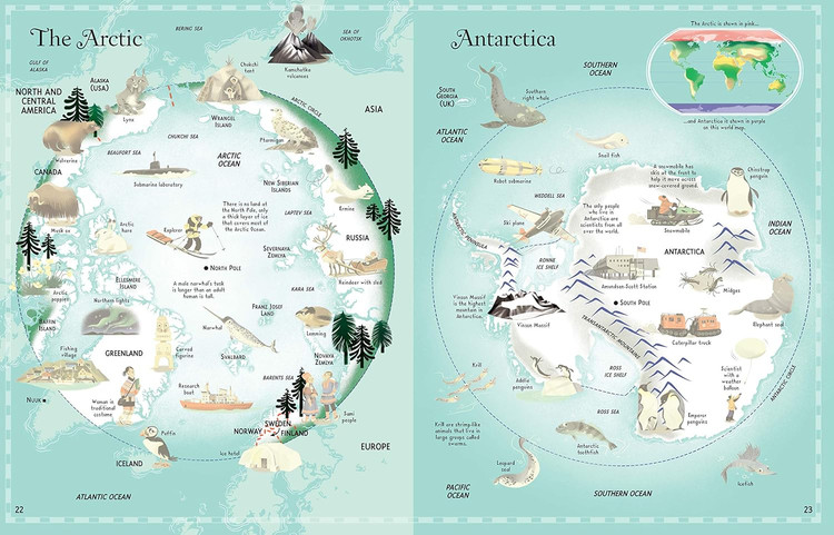 سفری تعاملی در سراسر جهان، که در آن کودکان میتوانند برچسبهای مکانهای دیدنی، حیوانات و افراد را در مکانهای مناسب قرار دهند و در حین رفتن بیشتر درباره جهان بیاموزند. تصاویر جدید و مدرن این اولین اطلس پر جنب و جوش و جذاب را تبدیل کرده است.