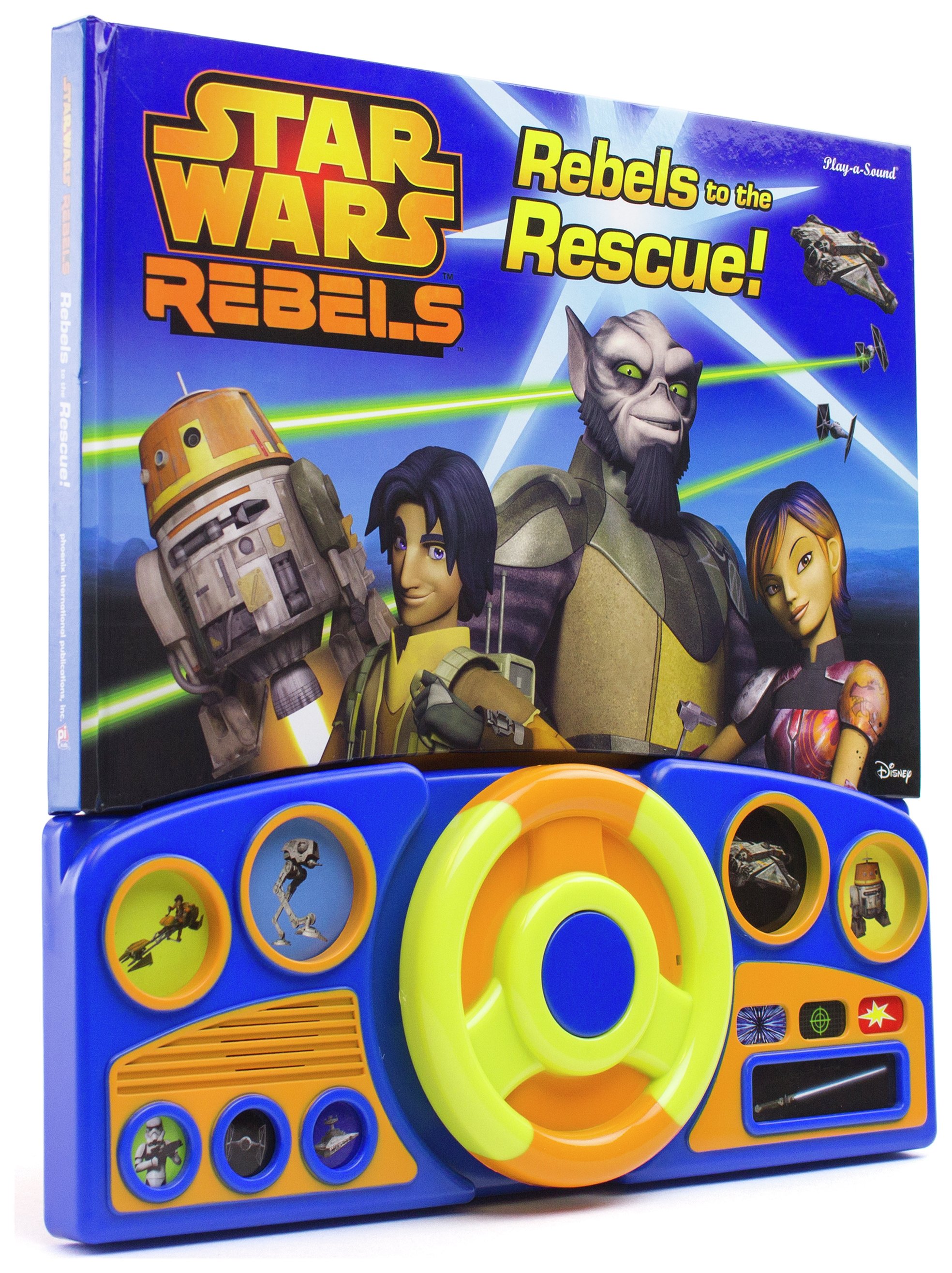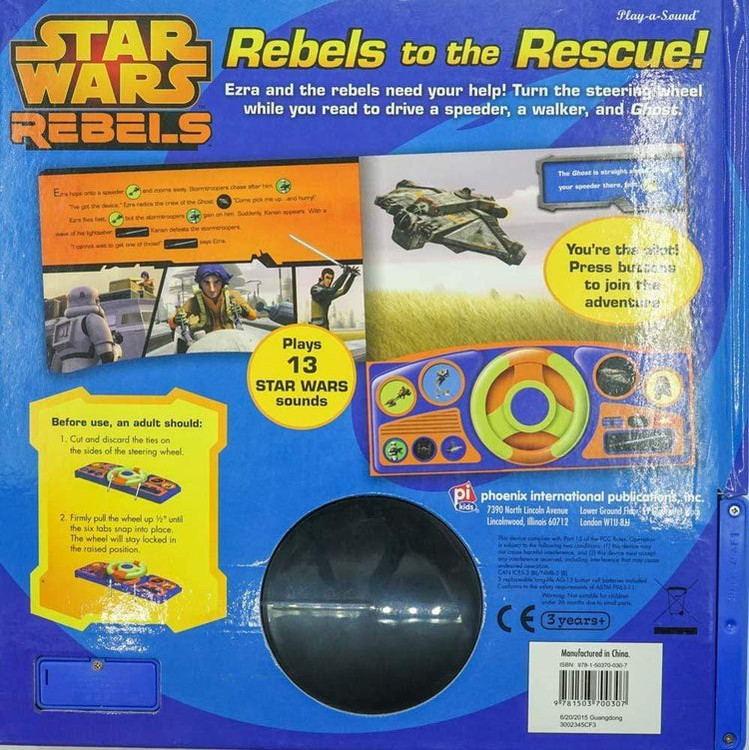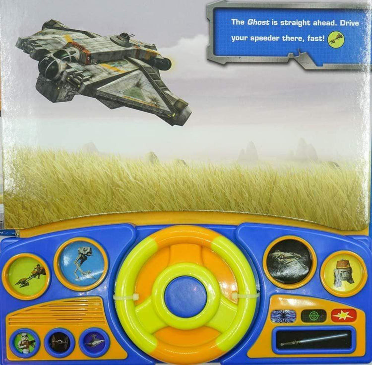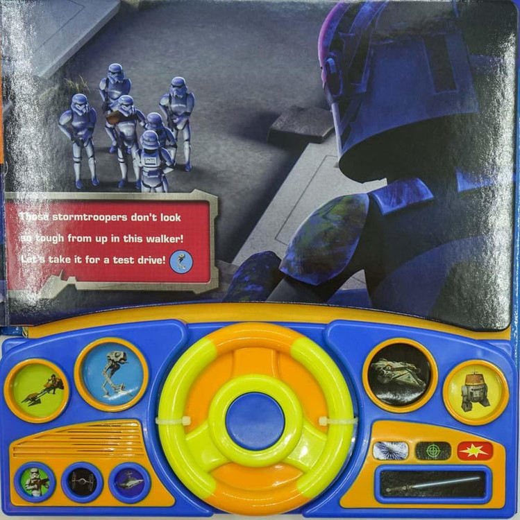 13 صدای جنگ ستارگان را پخش می کند. شما داستان را هدایت می کنید. چرخاندن فرمان در هر دو جهت باعث ایجاد صدا می شود. بوق کار و 11 صدای داشبورد اضافی. کتاب صدای فرمان جنگ ستارگان.