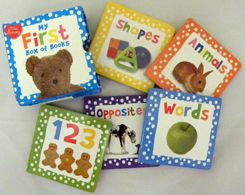 My First Box of Books مجموعه ای از شش کتاب کوچک است که در یک جعبه محکم نگهداری می شوند. هر کتاب کوچک حاوی کلمات ساده با عکاسی روشن است تا کودکان کوچک را با متن واضح و ساده سرگرم و سرگرم کند