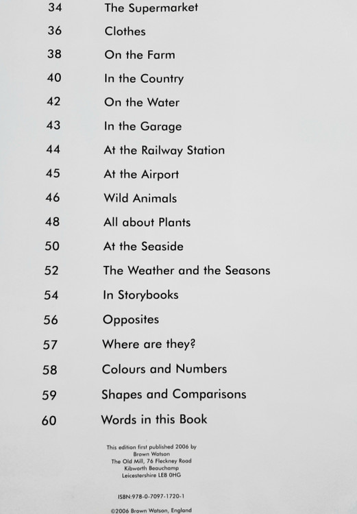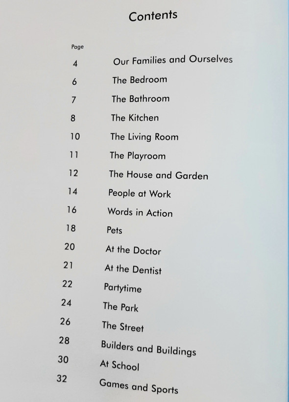 کلماتی که با دقت انتخاب شده اند به ده ها موضوع روزمره تقسیم می شوند، از جمله خانواده ما و خودمان، لباس، خانه و باغ، افراد در محل کار، حیوانات خانگی، حیوانات وحشی، در مدرسه، بازی ها و ورزش ها و بسیاری موارد دیگر.