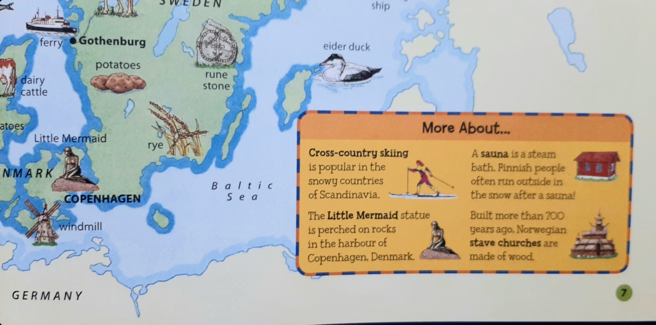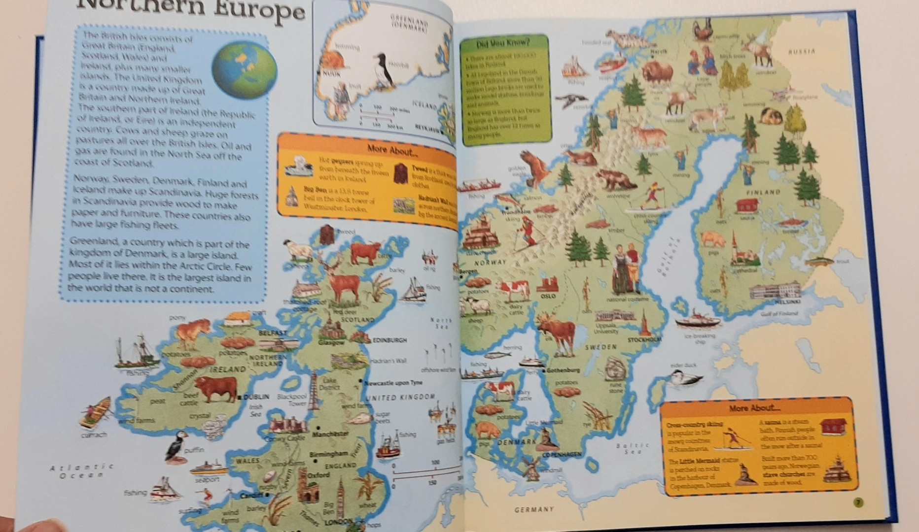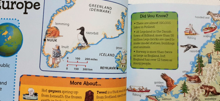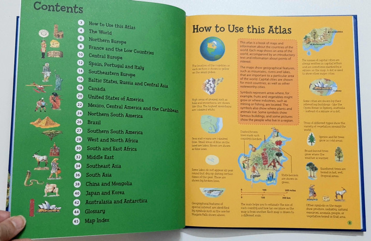 بیست و یک نقشه تصویری، که هر کدام با متن قابل دسترسی پر از واقعیت همراه است، شکلهای زمین و ویژگیهای فرهنگی، صنعتی و کشاورزی را برای هر کشور نشان میدهد. بچهها دوست دارند روی این نقشههای شلوغ نگاه کنند و تصاویر دقیق را جستجو کنند تا اطلاعات بیشتری در مورد هر کشور پیدا کنند.