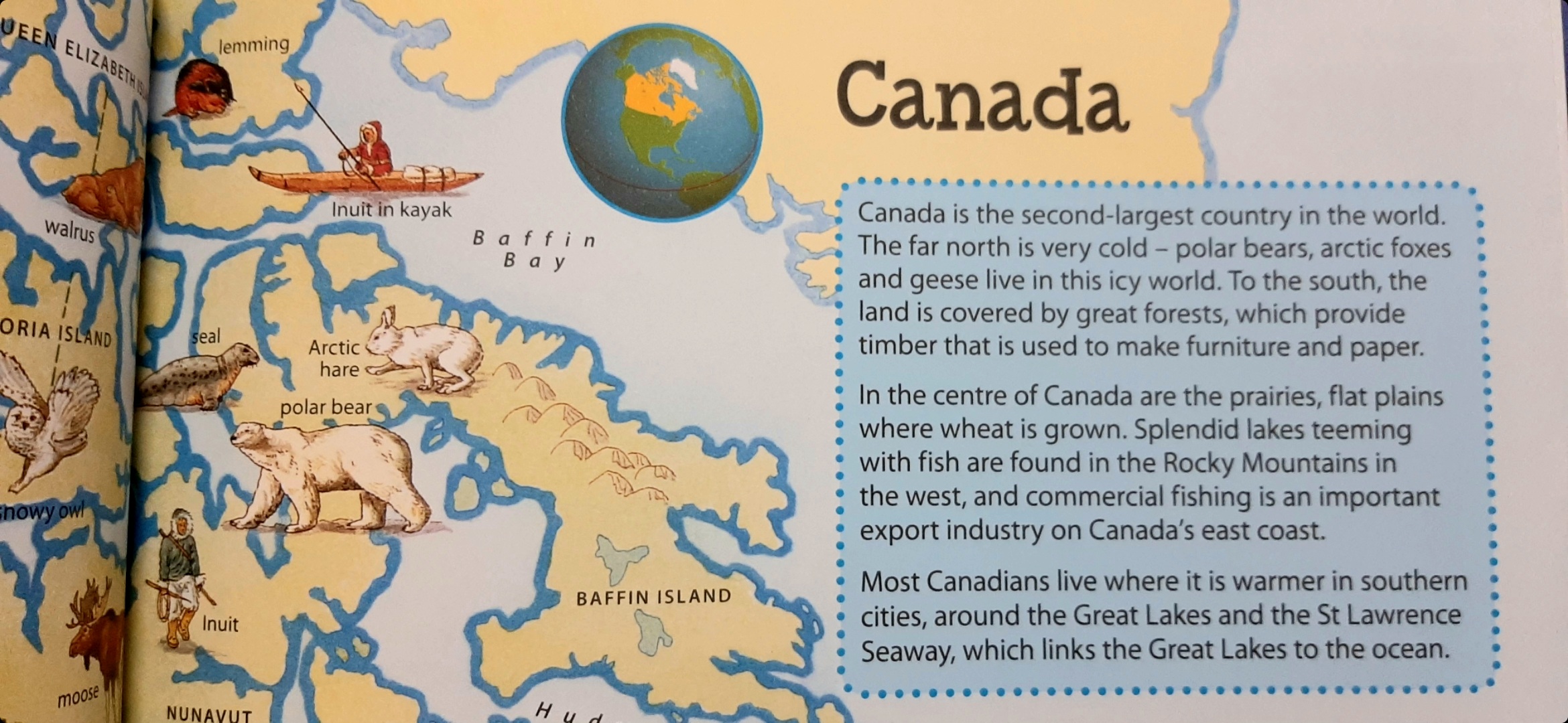 بیست و یک نقشه تصویری، که هر کدام با متن قابل دسترسی پر از واقعیت همراه است، شکلهای زمین و ویژگیهای فرهنگی، صنعتی و کشاورزی را برای هر کشور نشان میدهد. بچهها دوست دارند روی این نقشههای شلوغ نگاه کنند و تصاویر دقیق را جستجو کنند تا اطلاعات بیشتری در مورد هر کشور پیدا کنند.