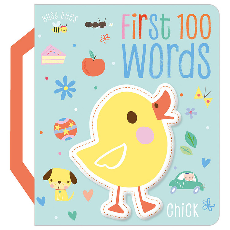 کتاب کلمات اول با وصله روی جلد و دستگیره حمل کتابی با مصور زیبا با بیش از 100 کلمه اولیه که به مضامین یادگیری اولیه تقسیم شده است.