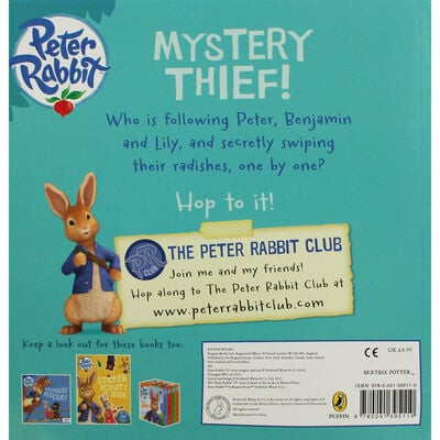 پیتر خرگوشه: دزد رمز و راز The Tale of the Radish Robber پیتر، بنجامین بانی و دوست جدیدشان - خرگوش سفیدی به نام لیلی بابتیل - را می بیند که سعی می کنند جایی امن پیدا کنند تا از تربچه هایی که از باغ سبزیجات آقای مک گرگور دزدیده اند لذت ببرند. ولی یکی دیگه هم دنبالشونه... کی میتونه باشه؟ آیا آقای تاد دندان گیر است؟ آیا آجیل سنجاب احمقانه است؟ یا اینکه کسی خیلی به خانه نزدیکتر است