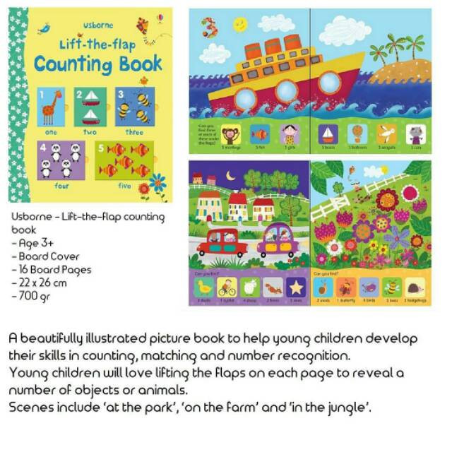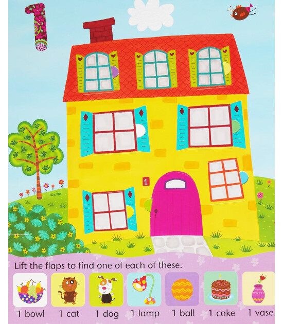 این یک کتاب کلمه تصویری شیک و با مصور زیبا با فلپ هایی برای بلند کردن برای تشویق مهارت های شمارش و تشخیص اعداد است. هر صفحه مضمون دارای تعداد زیادی فلپ برای بلند کردن تعداد اشیا یا حیوانات زیر است. فلپهای صفحه مقابل همان عدد را با یک تصویر همراه و با ظرافت نشان داده شده در زیر نشان میدهند. تم ها شامل پارک، مزرعه و باغ است.