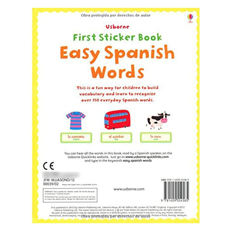 این یک کتاب واژگان مفید و سرگرم کننده برای زبان آموزان اسپانیایی است، با موضوعاتی که شامل حیوانات، بدن و لباس، خانواده و دوستان، غذا، خانه، در شهر، اعمال، رنگ ها و اعداد است. این برای ساخت واژگان اولیه در یک زبان خارجی بسیار موثر است، و تشویق مستقیم کلمه اسپانیایی با تصویر - جذاب و به یاد ماندنی است. همه کلمات را که توسط یک اسپانیایی زبان مادری خوانده شده است، در پیوندهای سریع Usborne بشنوید