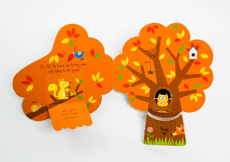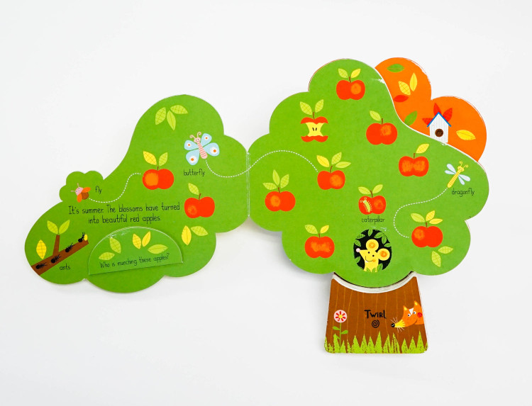 این کتاب مقوایی با شکل منحصربهفرد خود، چرخهی سال را از طریق درختی به تصویر میکشد که در بهار شکوفه میدهد، در تابستان میوه میدهد، در پاییز برگهایش را میریزد و در زمستان برف را در آغوش میگیرد.