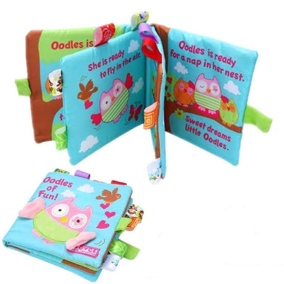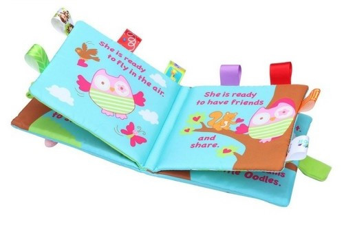 کتاب پارچه ای زیبای جغد با گلدوزی و بالهای برجسته از کتاب با تگ های رنگی جذاب مناسب کودکان زیر سه سال برای تقویت عضلات ظریف انگشتان دست.