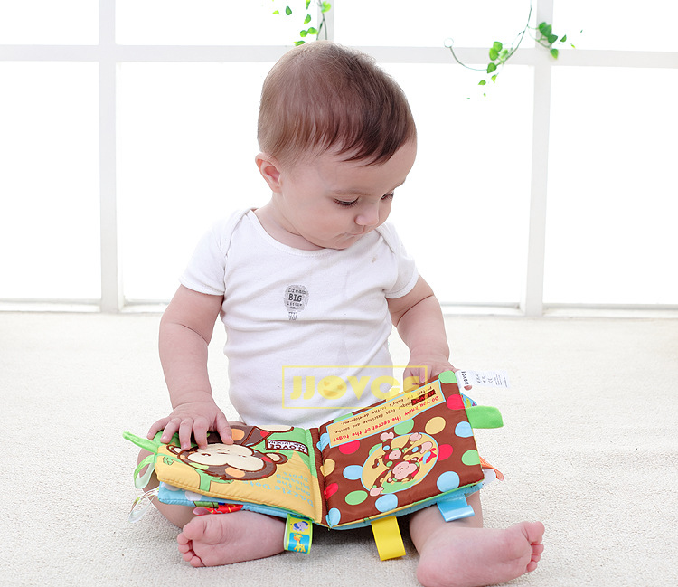 کتاب پارچه ای زیبای میمون با گلدوزی و بالهای برجسته از کتاب با تگ های رنگی جذاب مناسب کودکان زیر سه سال برای تقویت عضلات ظریف انگشتان دست.