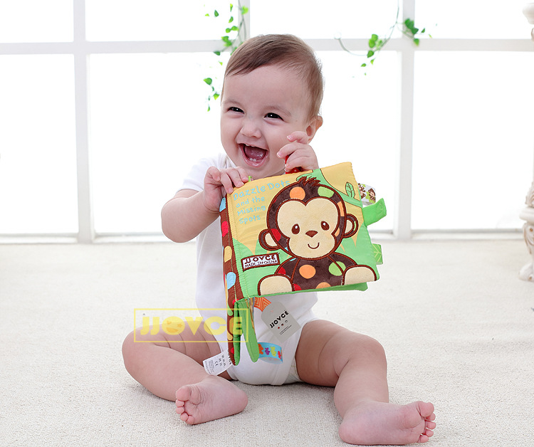 کتاب پارچه ای زیبای میمون با گلدوزی و بالهای برجسته از کتاب با تگ های رنگی جذاب مناسب کودکان زیر سه سال برای تقویت عضلات ظریف انگشتان دست.